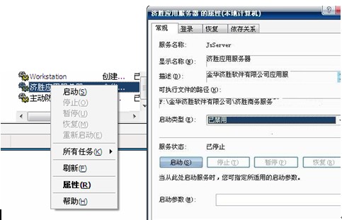 创建快捷方式,属性添加uninstall,去掉服务,然后再用install添加服务再启动,还是不行,操作系统重启也不行。右击服务中的“济胜商务服务器”,属性里发现可执行文件的路径我们安装的服务端的路径有所区别,后来找到相应文件夹,再删除服务并且重装服务即可。